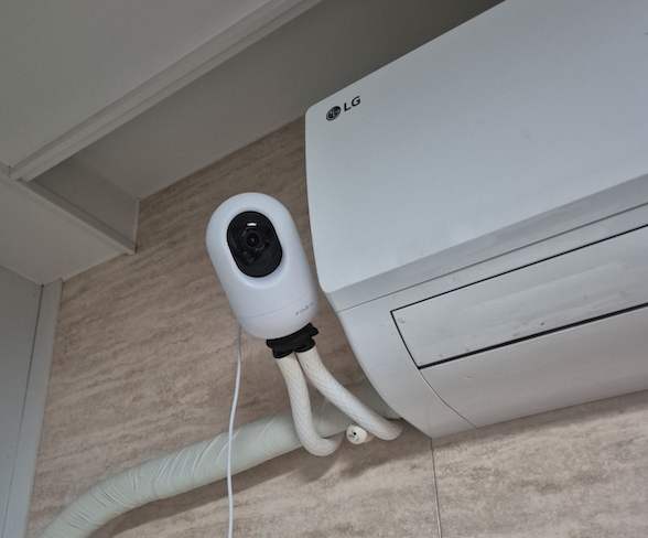 홈페이지에서 함께 판매하는 '거치 삼각대'는 꼭 같이 구매하시길 추천합니다. 다리가 문어발처럼 유연해서 거실에서는 벽걸이 에어컨 배기관에, 침실에서는 커튼봉에 감아서 설치했는데 꽤 무거운 본체임에도 한 번도 떨어진 적 없이 튼튼하게 고정되어 있습니다.