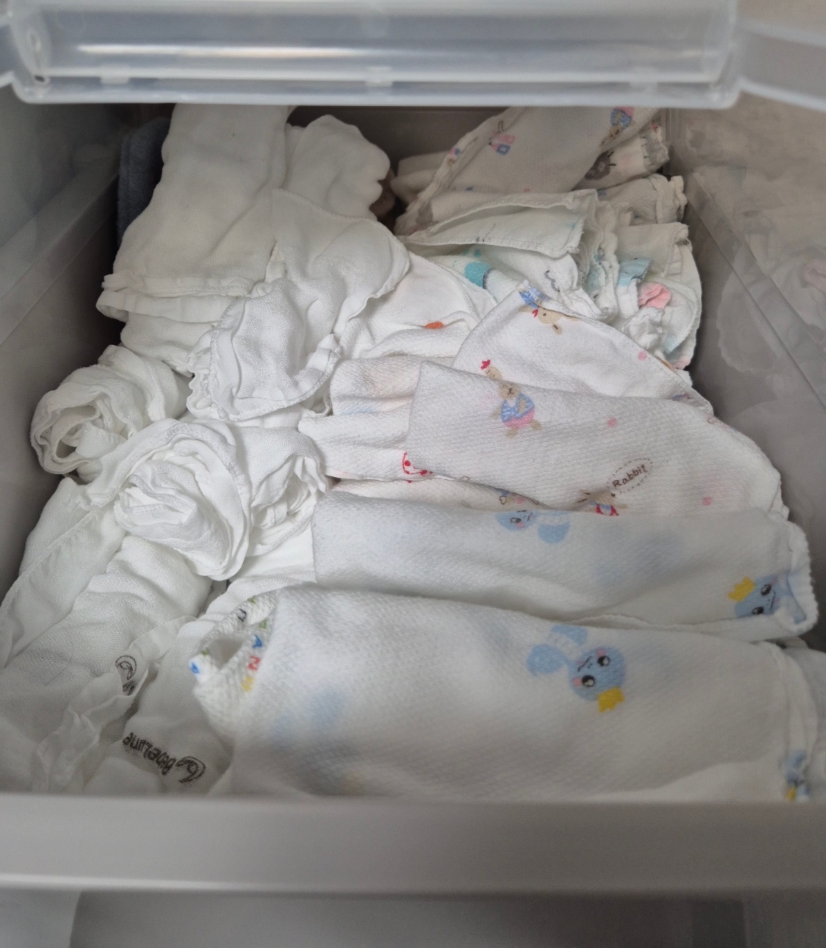 요새는 빨래 후 수량이 많으니까 하나하나 정성껏 개지 않고, 한 번만 접어 대충 말아서 바구니에 넣어둡니다. 깔끔하게 개어져 있지는 않지만 아기에게 사용할 때 펼쳐서 쓰면 그만입니다. 이 작은 변화가 정리 시간을 획기적으로 줄여줍니다.