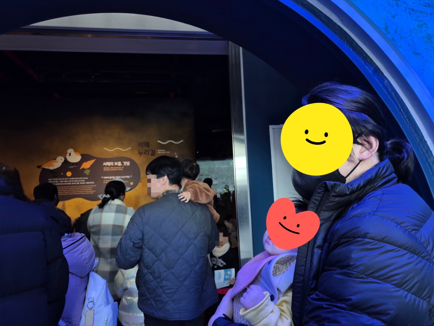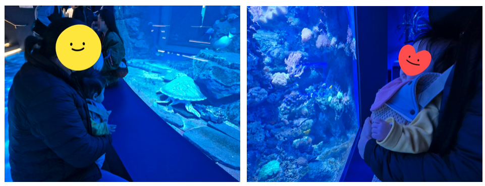 아직은 아기가 4개월이라 깨시(깨어 있는 시간)가 그리 길지 않고, 너무 자극이 많으면 피곤해합니다. 활동 프로그램을 할 수는 없으니 그냥 물고기 구경만 하다 오면 되는데, 볼 게 너무 많으면 과각성 상태에 빠져서 힘들어합니다. 1시간 내외로 구경하는 게 딱 좋더라고요.