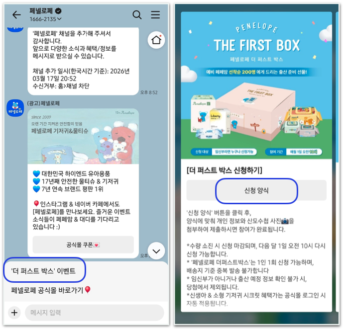- 신청 방법: 페넬로페 카카오톡 채널 추가 → 채팅창 위 '더 퍼스트 박스' 이벤트 클릭
