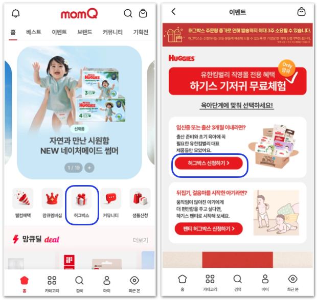 - 신청 방법: 맘큐 앱 설치 후 홈 화면 중앙의 '허그박스' 배너 클릭