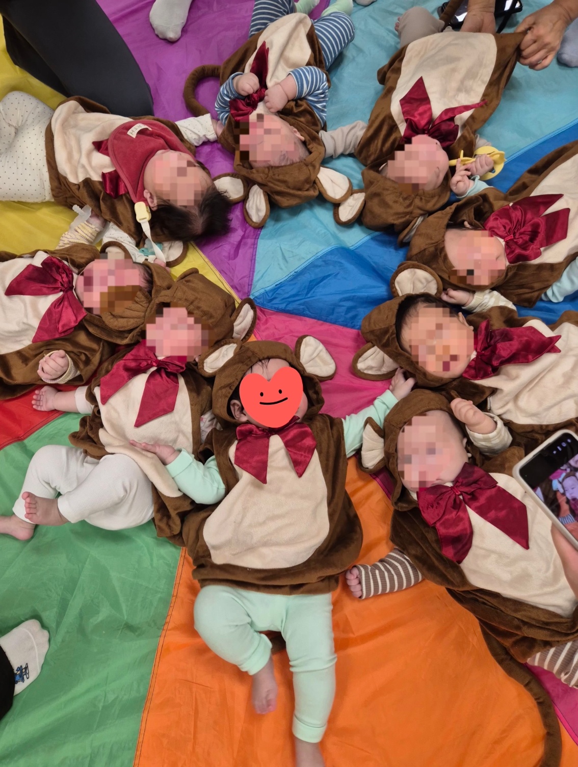 가장 귀여웠던 시간은 원숭이 옷을 입고 사진 찍는 타임! 사실 이 시간에 '이건 왜 하는 거지?' 하는 생각은 했습니다. 하지만 집에서 이런 코스튬을 사서 입히기는 힘든데, 이런 시간이 있어서 엄마 입장에서는 아기가 너무 귀엽고 재미있었습니다. 옹기종기 모여서 눕힌 다음 사진을 찍는데, 모자이크 너머로 보이는 아기들의 표정은 울먹울먹하거나 이미 우는 아기, 멍 한 아기 등 좋아보이진 않아서 엄마들만 신난 시간이기도 했습니다.