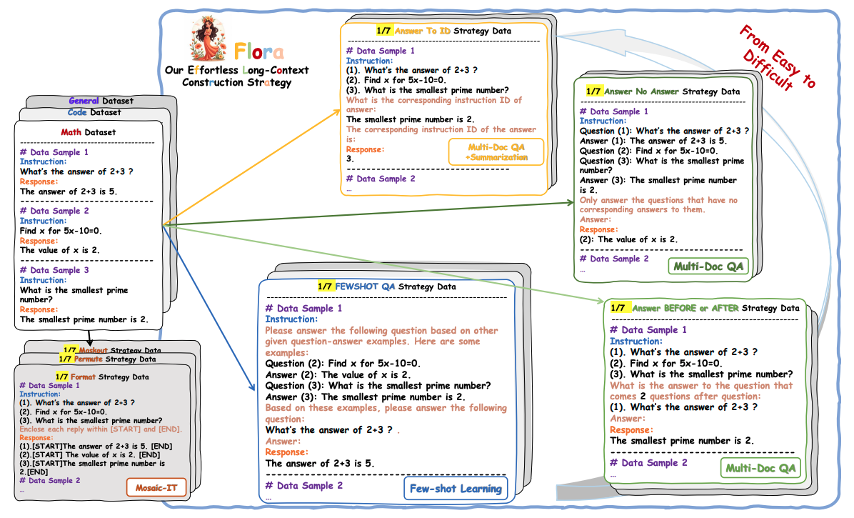 Flora는 이러한 문제들을 해결하기 위해 완전히 새로운 관점을 제시합니다. LLM이나 사람의 개입 없이 기존의 짧은 instruction-tuning 데이터만으로 원하는 길이의 문맥을 생성할 수 있다는 것이 핵심입니다. 이 방법은 짧은 instruction-response 샘플들을 그룹화하여 기본 길이를 확장하고, 그 뒤에 metadata instructions를 설계하여 모델이 긴 context를 자연스럽게 이해하도록 유도합니다.