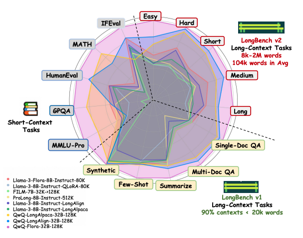 Flora의 실험 결과는 매우 고무적입니다. 논문에서는 Llama3-8B-Instruct와 QwQ-32B 모델을 대상으로 광범위한 실험을 수행했습니다. 비교 대상으로는 Mosaic-IT, LongAlign 등 기존의 Long-context 방법들이 포함되었으며, 80k, 128k 토큰 입력과 같은 다양한 길이에서 평가가 이루어졌습니다. LongBench v2와 같은 표준 벤치마크를 사용한 평가는 결과의 신뢰성을 더욱 높였습니다.